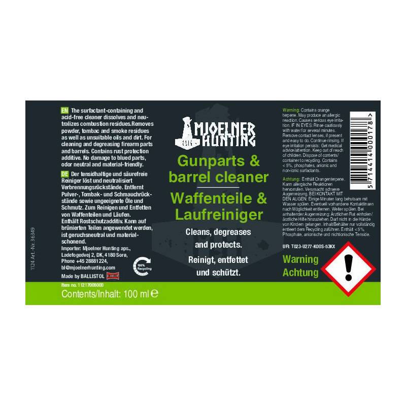 The Mjoelner Gun Cleaner (100 ml) is a high-performance, acid-free firearm cleaner designed to keep your rifle, shotgun, or handgun in top condition. Developed with surfactant technology, it dissolves and neutralises combustion residues quickly and effectively, removing powder, tombac, smoke deposits, unsuitable oils, and dirt.