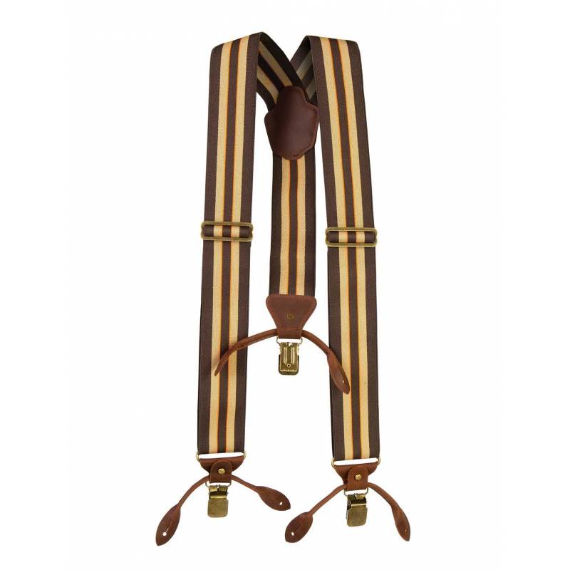Fully adjustable braces in Beretta iconic shoulder strap material. These elastic braces have both metal gripper attachments and buttons, and feature leather details.
