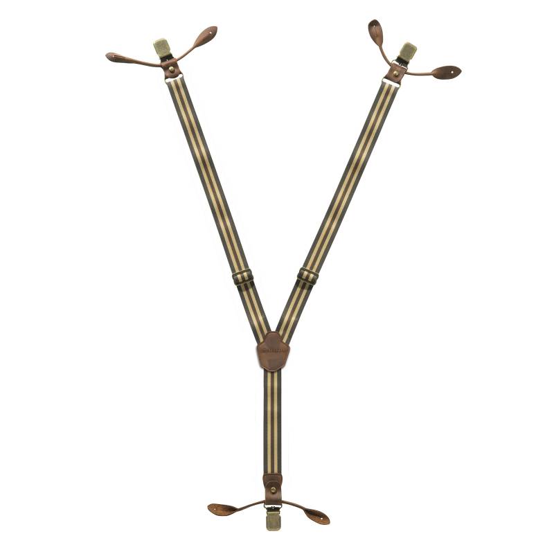 Fully adjustable braces in Beretta iconic shoulder strap material. These elastic braces have both metal gripper attachments and buttons, and feature leather details.