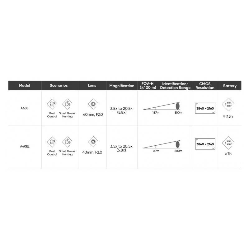 Engineered for low-light dominance, the A40E features adaptive 4K imaging and advanced rendering at 50hz for static surveillance and up to 100hz at 1080P for high-speed target tracking. Whether you're scanning a distant nest or pursuing a fast-moving quarry, the result is zero blur, maximum clarity, and unwavering precision. An external IR torch can be added for enhanced nocturnal range.