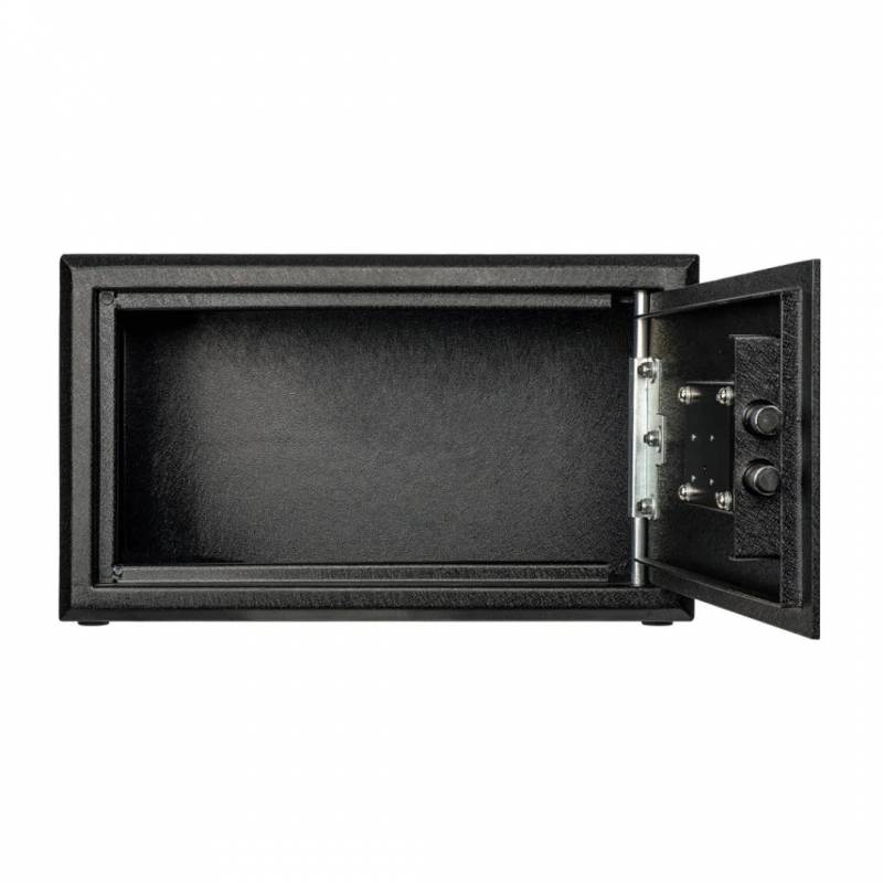 The S3A uses the same key lock system and door construction as the Spika gun safe range, with a 3mm steel door, 2mm steel body, and 6mm reinforced door edge incorporating Spika's registered deadlock anti-pry system. The interlocking teeth along the door edge engage under pressure, preventing the door from being levered open. Two locking bolts secure the door, and pre-drilled bolt-down holes allow the safe to be fixed independently to a floor, shelf, or wall surface if used separately from a gun safe.