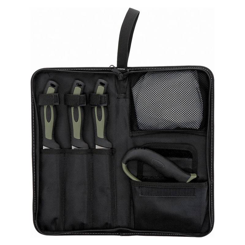 The Old Timer Lightweight Field Dressing Kit 1123128 is the ultimate all-in-one solution for hunters who value efficiency and reliability in the field. This five-piece hunting set includes three essential knives: a Caping Knife, Gut Hook Knife, and Boning Knife, along with a pull-through sharpener and three pairs of latex gloves. Everything packs neatly into a durable nylon storage bag, making it easy to carry and access during your next hunt.