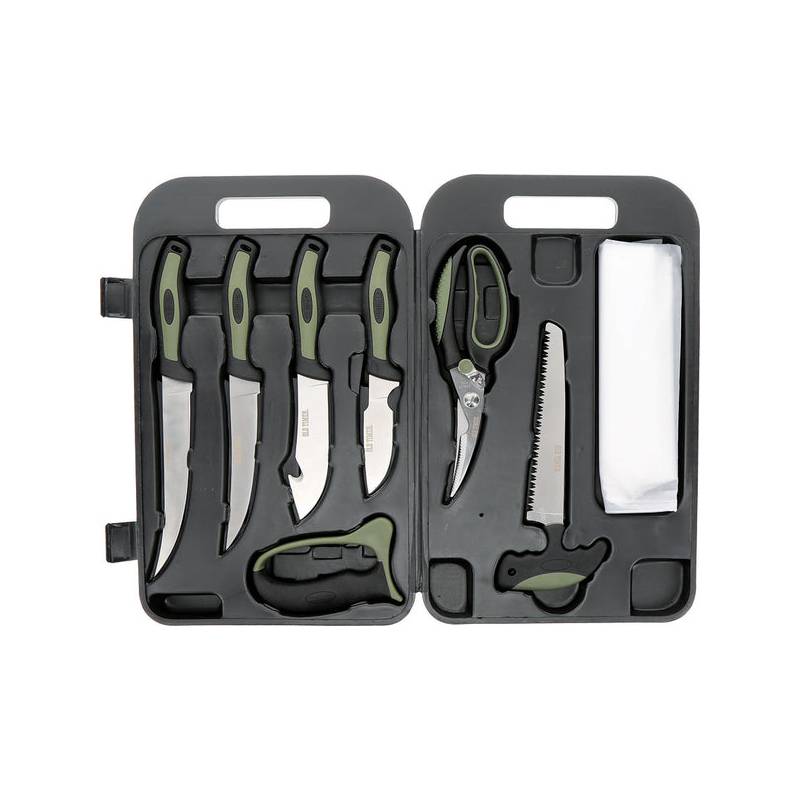 The Old Timer Outdoor Kit Kit 1123120 is the ultimate all-in-one outdoor and hunting solution for field dressing, food prep, and campsite use. Designed for versatility, this 9-piece kit includes four high-performance knives, (poultry) shears, a saw, a pull-through sharpener, three pairs of latex gloves, and a plastic cutting board, all neatly organized inside a rugged plastic carrying case. Whether you’re field dressing game or preparing meals at camp, this kit is built to handle it all.